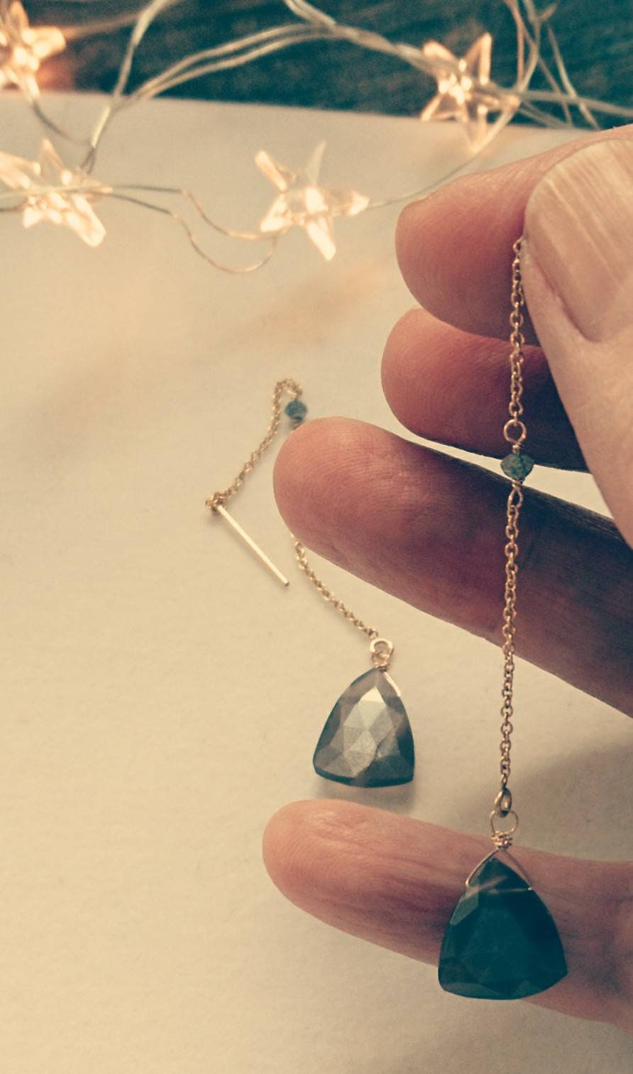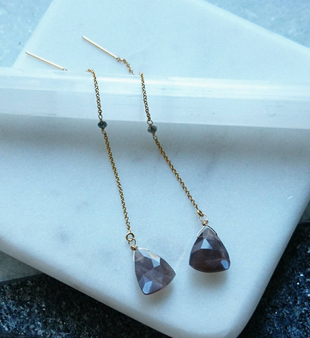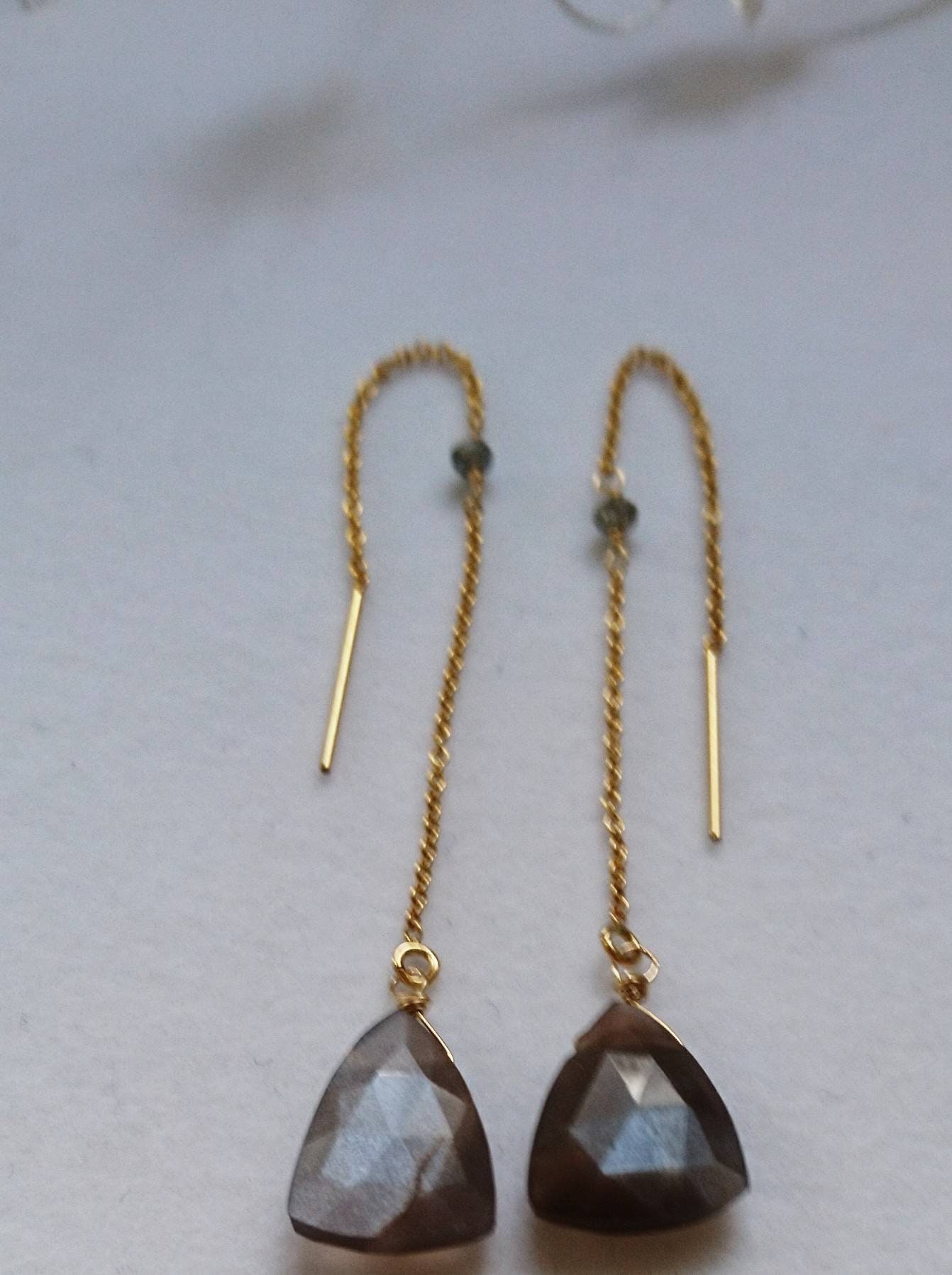 14k Gold filled threader earrings with faceted chocolate moonstone and faceted black diamonds. These earrings are chic and luxurious and on trend. Brown is one of the must have colours for this autumn/fall and winter. The diamonds are dazzling. The chocolate moonstone is captivating, when the light catches it you can see it is semi opaque.